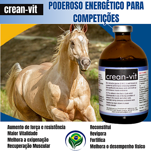 crean-vit é uma vitamina a base de creatina, e aminoácidos combinados com adenosina e microminerais injectável para a preparação de energia muscular, prevenção e tratamento de deficiências vitamínicas e minerais em cavalos e outros animais de grande porte.Indicados para animais de treinamento de alta performance para recuperação pós treino e explosão de energia durante o treinamento.